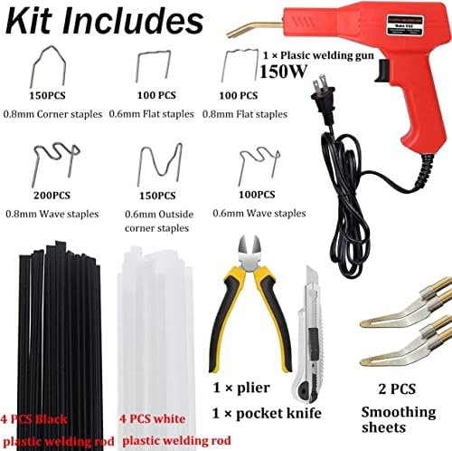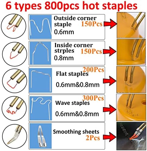 🧰【WHAT YOU WILL GET】: 1 x Plastic Welding Machine, 1 x Carrying Case, 8 x welding rod, 2 x smoothing head, 800PCS hot staples (200PCS 0.8mm wave staples, 100PCS 0.8mm flat staples, 100PCS 0.6mm flat staples, 100PCS 0.6mm wave staples, 150PCS 0.6mm M staples and 150PCS 0.8mm V staples) , 1 * pliers, 1 * utility knife.