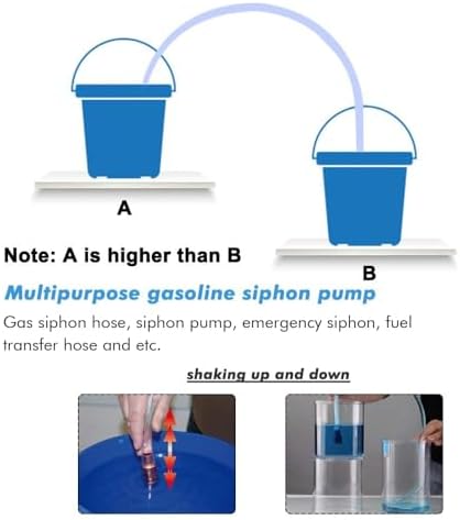 【Safe Notice】This siphon pump for gasoline not for use on salt water or copper corroding chemicals. When you put fitting end into the container( you are siphoning from), must keep it inside of the container not just on the surface and the fluid you are trying to get rid of has to be up HIGHER than the bucket you are flowing into.