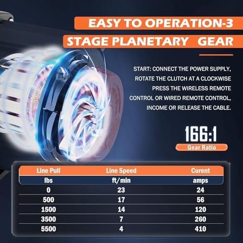 ADVANCED PLANETARY GEAR SYSTEM: The winch uses an advanced combined planetary gear system with a gear speed ratio of 166:1, which is higher and faster than other winches, saving your time and bringing you a better experience. In addition, its minimum cold start current is 10A.