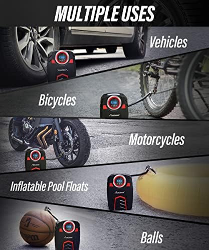Multiple Use with 4 Nozzle Adaptors – This portable air compressor is suitable for inflating tires on cars, bicycles, motorcycles, midsize Sedan and SUVs, sport balls, pool toys, cushions, small air mattress and other inflatables. NOTE: It is NOT applicable for commercial vehicles, trucks, motor lorries or large volume inflatables.