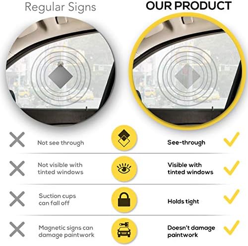 ⭐ GUARANTEED TO STAY ON: The waterproof sticker uses strong adhesive to ensure it won’t peel off your car window and it’s built to endure all weather conditions. Since it is applied on the outside of the car it can be used with TINTED WINDOWS unlike signs with suction cups which also lose suction and lack longevity while magnetic signs risk damage to paint work. Our sticker sign is the perfect sign