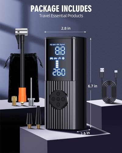 【Dual Screen Display】The portable air pump built in high-performance chip, it can quickly inflate tires and provide high-speed airflow. Inflate small car tires in less than 1 minute. The large-sized LED display screen displays real-time pressure values and preset values, making it easy to monitor tire pressure status. The automatic shutdown design can also prevent excessive inflation, making it safe to use.