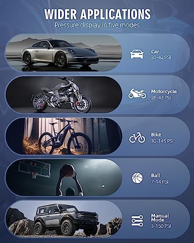 【4+N Inflation Mode】The air compressor has four types of pressure units: PSI, KPA, BAR, and KG/CM ². There are four preset inflation modes: bicycle, motorcycle, car, and ball. The fifth custom mode can also set pressure values based on the inflation object to meet various inflation needs. It is an essential product for daily life and travel.