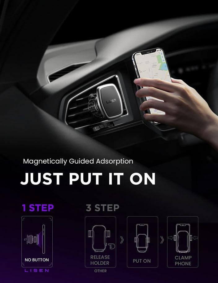 👍LOCK YOUR PHONE FIRMLY: LISEN Magnetic Phone Car Mount with 6 built-in strong magnets, the maximum bearing up to the weight of 6 tablets. Powerful suction keeps your cellphone stay stable even on a bumpy road. PLEASE NOTE:1. It is recommend that use the “square pad” on the back of your phone/case. It is more stable than the round. 2. ANY DEVICE NEEDS TO USE THE METAL PALTE EVEN iPhone 12 and iPhone13 14 15 .