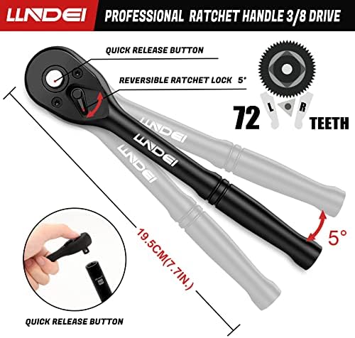 ✔MASTER SET INCLUDES: 1x 3/8″ U-Joint; 1x 3/8” Quick Release Ratchet Handle low-profile, 72T; 28-Metric Deep and Shallow Sockets: 8, 9, 10, 11, 12, 13, 14, 15, 16, 17, 18, 19, 21, 22mm; 16- SAE Deep and Shallow Sockets: 5/16, 3/8, 7/16, 1/2, 9/16, 5/8, 11/16, 3/4”; 2-SAE Spark Plug Sockets: 13/16, 5/8; 2x 3/8” Extension Bars: 3”, 6”; 1x T-Bar Adaptor; 1-piece 3/8F*1/4M Adaptor; 1x Spinner Handle; 1x Coupler for Bit; 40x Bits; 1x 3/8” Socket Adapter for power tools.