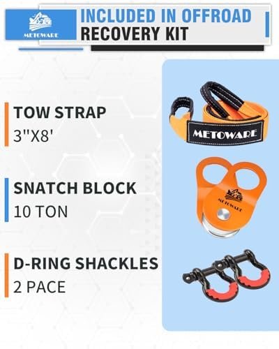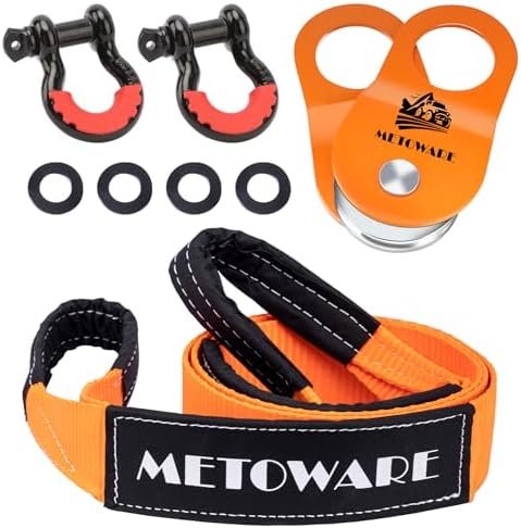 OFF-ROAD RECOVERY KIT: METOWARE towing recovery kit includes 1pcs tree saver (3in x 8ft , Orange), 2pcs 3/4″ D Ring Shackle, 1pcs snatch block.