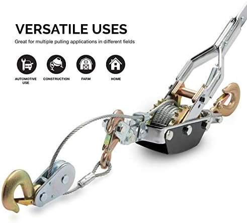 WINCH HOOK: Heavy duty puller steel construction for added durability; hooks and gears are zinc plated for a long-lasting life in your garage or workshop when pulling, dragging, lifting, or stretching. Safety latch on all hooks to prevent accidents or slipping off.