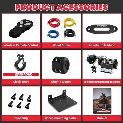 【Versatile Applications】The OPENROAD 4500 lbs winch combines outstanding off-road capabilities with professional and high-quality service. It is designed for use with ATVs, UTVs, cars, trucks, amusement rides, boats, jeeps, modified vehicle equipment, and household trailers, among other applications. Universally fits YXZ1000R, Maverick X3, Maverick Trail, Commander, Pioneer series, Mule series, Teryx KRX 1000, Gator series, Wildcat series and other models of UTV.