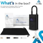 Air Pump with Tire Pressure Gauge : The AutoSky Portable air Compressor features a built-in digital tire pressure gauge that allows you to monitor the pressure level adjust it as needed.