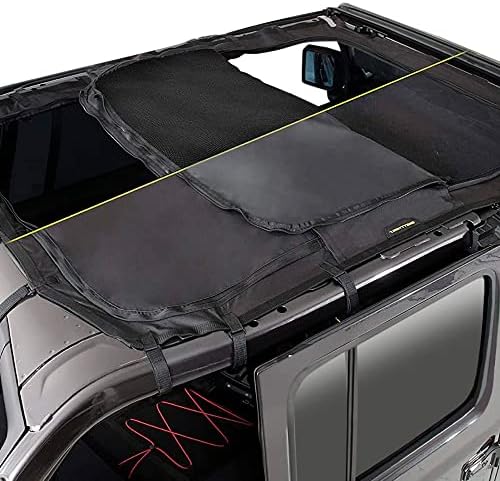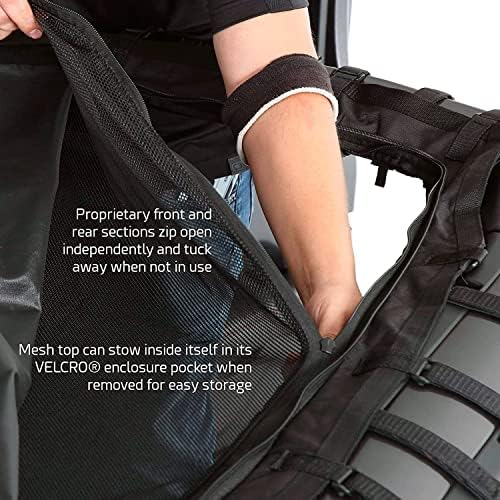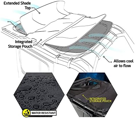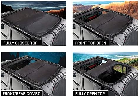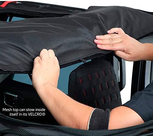 The Extended Shade Top with Skylights is a multi-use mesh cover that provides protective shade for passengers of the Jeep Wrangler JL 4-Door yet zips away to allow full sun when they want some rays. Heavy duty, UV- and mildew-resistant nylon material fends off the heat and glare of midday while allowing cool air to flow through the compartment. When it’s time to open up, the front and rear sections zip out independently and tuck away into a water-resistant center pouch in seconds. Attaching easily to the JL frame with VELCRO straps, the mesh top conveniently stays attached whether or not you have a hard top installed.