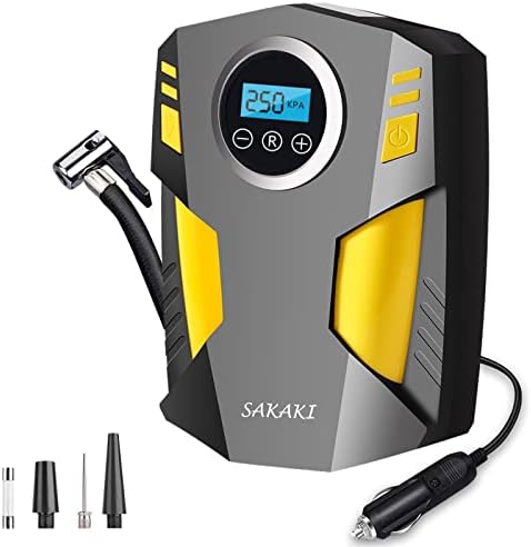 🚗【AUTO SHUT OFF】SAKAKI air compressor portable provides you with rest-assured using experience based on the auto-shut off function. Preset the desired pressure level and start inflating job. When our auto tire inflator reaches the desired pressure, the car air compressor turns off automatically, so you don’t need to worry about over inflating.